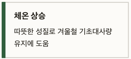 | 체온 상승 | 따뜻한 성질로 겨울철 기초대사량 유지에 도움 |