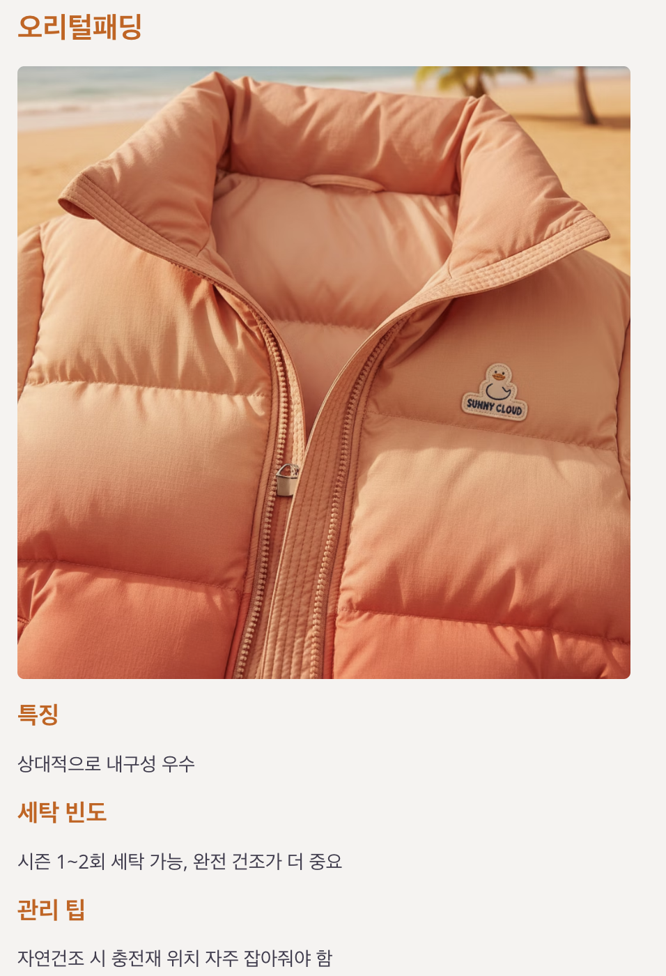 | 관리 팁 | 소매·목덜미 부분만 자주 관리 | 자연건조 시 충전재 위치 자주 잡아줘야 함 |