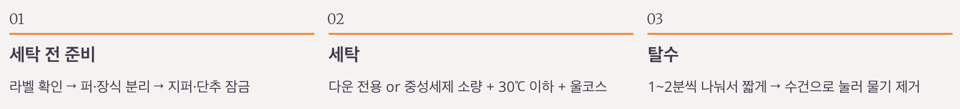 | 세탁 전 준비 | 라벨 확인 → 퍼·장식 분리 → 지퍼·단추 잠금 |