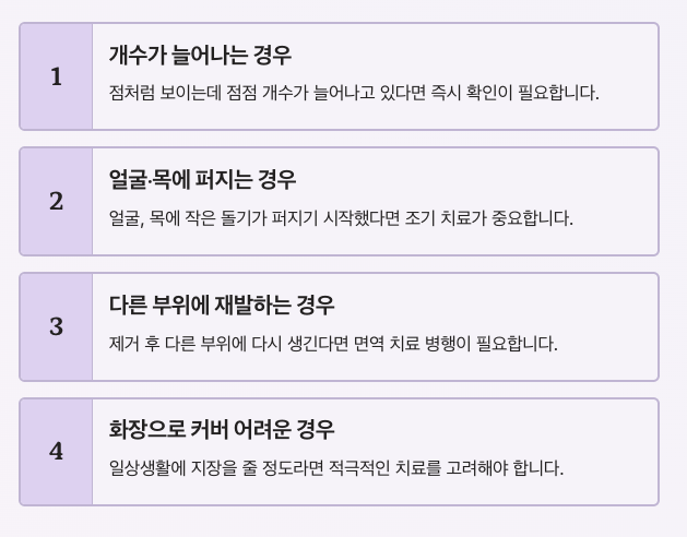 초기에 대응하면 치료도 간단하고 흔적도 적게 남지만, 방치할수록 치료 범위와 기간이 늘어날 수 있습니다.
