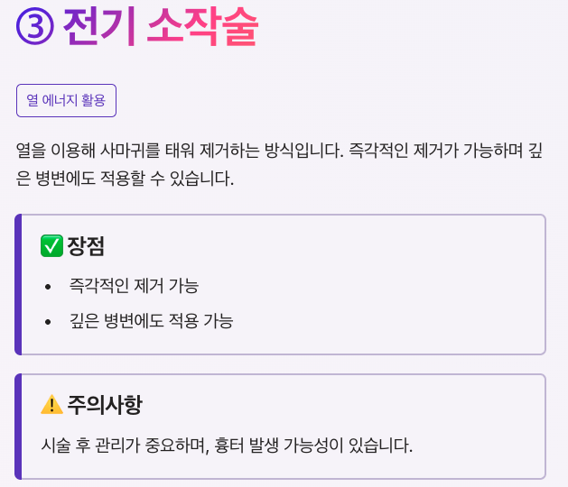 | 전기 소작 | 열로 제거 | 깊은 제거 가능 | 흉터 가능성 |