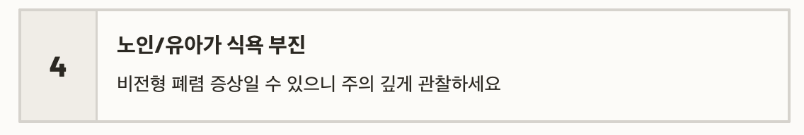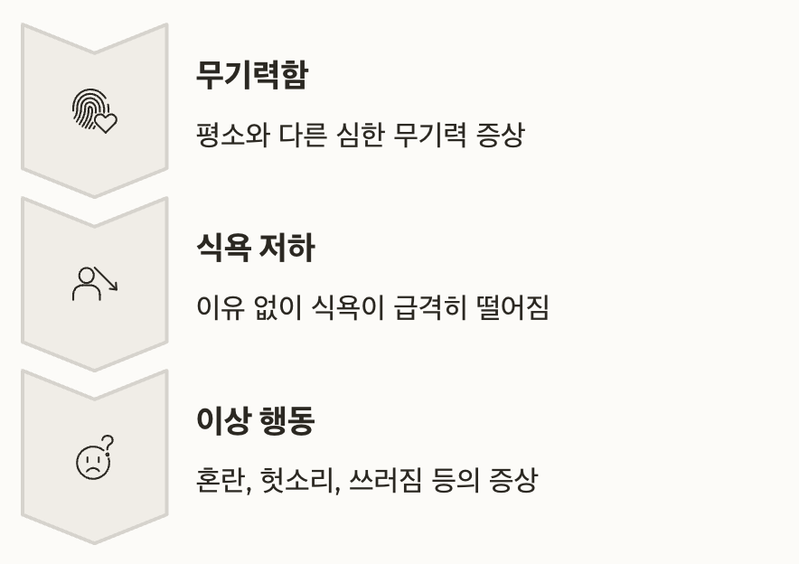 대신 평소와 다른 무기력함, 이유 없는 식욕 저하, 이상한 행동(혼란, 헛소리, 쓰러짐 등)이 나타날 수 있으니 각별히 주의해야 합니다.