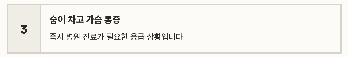 | 숨이 차고 가슴 통증 | 즉시 병원 진료 필요 |