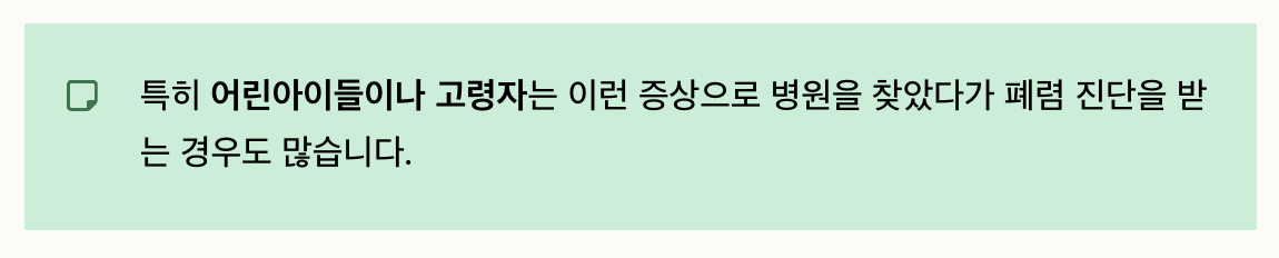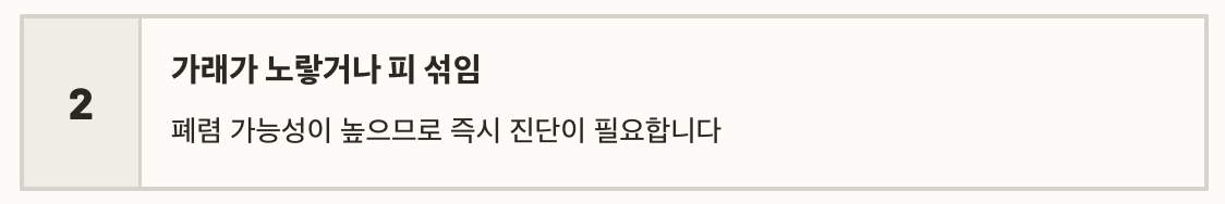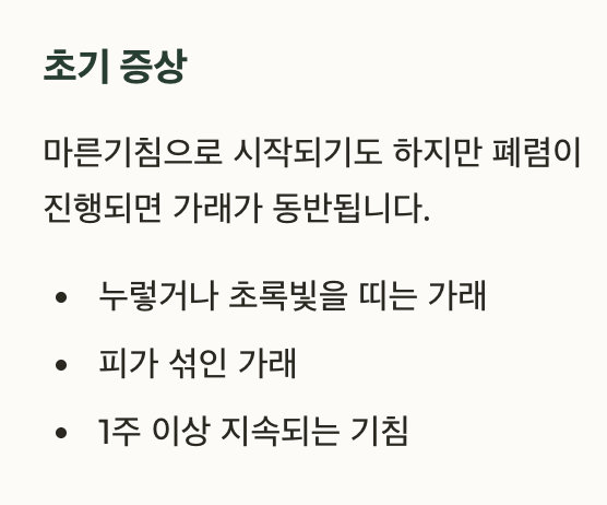 | 가래가 노랗거나 피 섞임 | 폐렴 가능성 높음, 진단 필요 |
