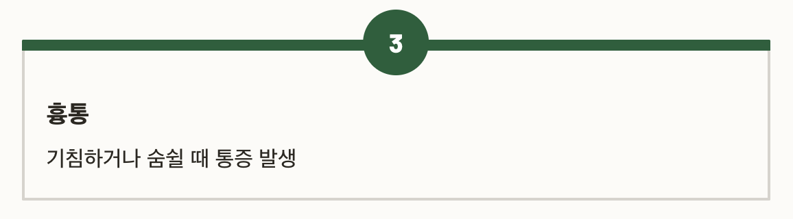 | 흉통 | 기침하거나 숨쉴 때 통증 발생 |