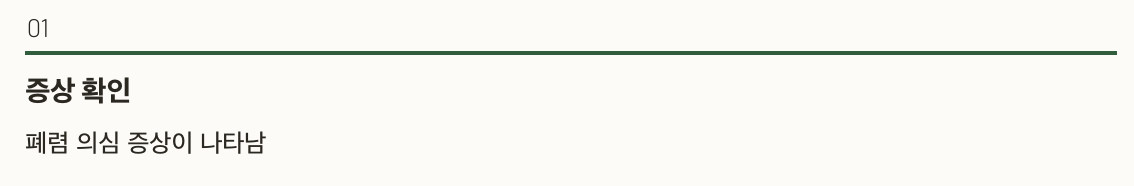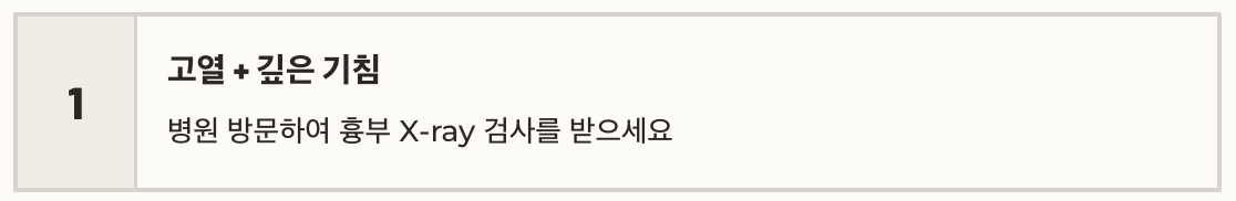 | 고열 + 깊은 기침 | 병원 방문하여 흉부 X-ray 검사 |
