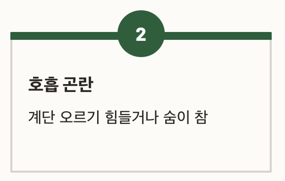 | 호흡 곤란 | 계단 오르기 힘들거나 숨 참 |