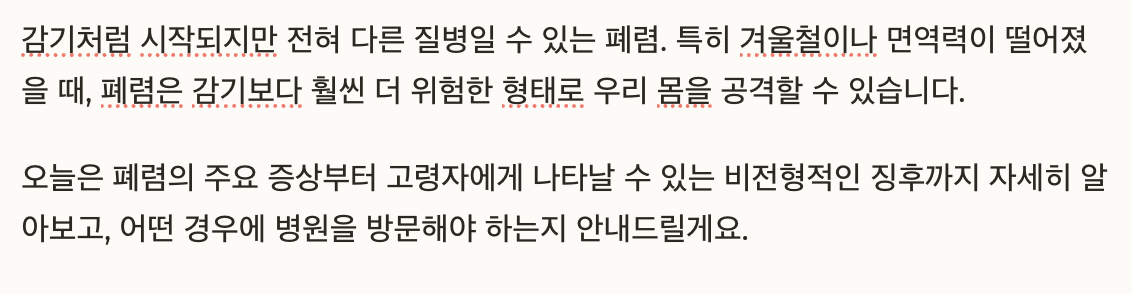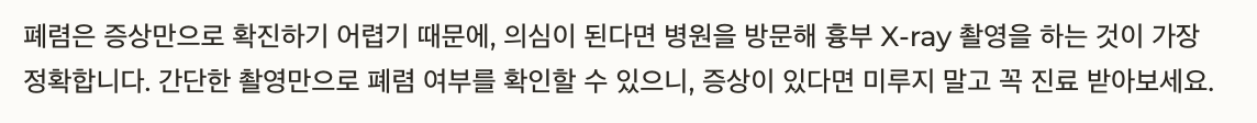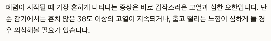특히 어린아이들이나 고령자는 이런 증상으로 병원을 찾았다가 폐렴 진단을 받는 경우도 많습니다.