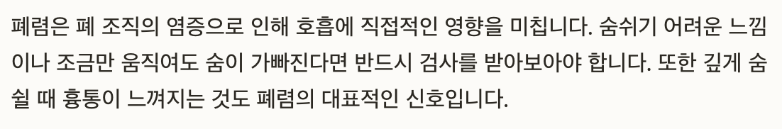 또한 깊게 숨 쉴 때 흉통이 느껴지는 것도 폐렴의 대표적인 신호입니다.