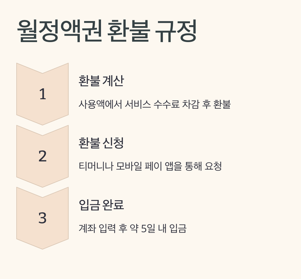 기후동행카드 등 월정액권은 사용액에서 서비스 수수료를 차감한 후 환불됩니다. 환불 요청은 티머니나 모바일 페이 앱을 통해 가능하며, 계좌 입력 후 약 5일 내 입금됩니다.