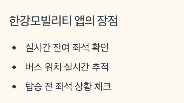 한강모빌리티 앱에서는 실시간 잔여 좌석과 위치를 바로 확인할 수 있습니다. 탑승 전 좌석 상황을 미리 체크하면 계획을 세우는 데 훨씬 유리합니다.