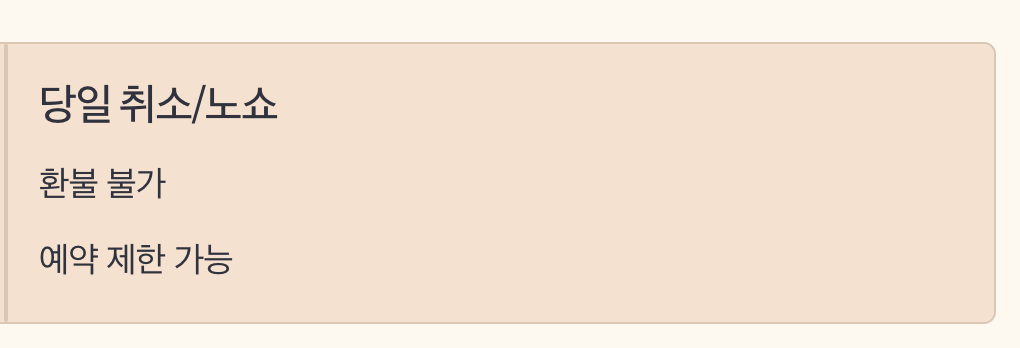 | 당일 취소/노쇼 | 환불 불가, 예약 제한 가능 | 해당 없음 |