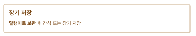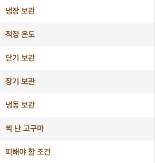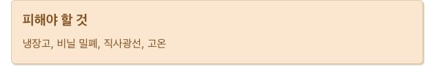 | 피해야 할 것 | 냉장고, 비닐 밀폐, 직사광선, 고온 |