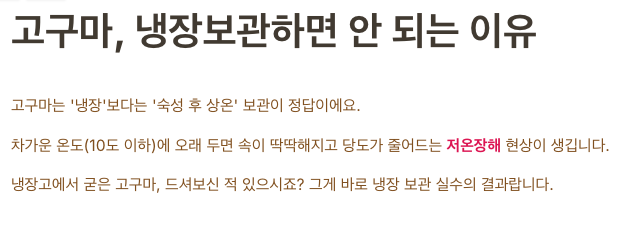 고구마는 '냉장'보다는 '숙성 후 상온' 보관이 정답이에요.
