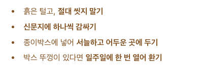 | 단기 보관 | 신문지+종이박스 / 통풍 잘 되는 곳 |