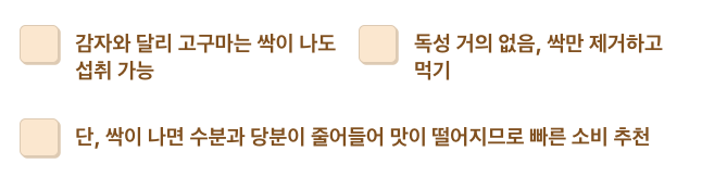 - 단, 싹이 나면 수분과 당분이 줄어들어 맛이 떨어지므로 빠른 소비 추천