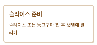 - 슬라이스 또는 통고구마 찐 후 햇볕에 말리기