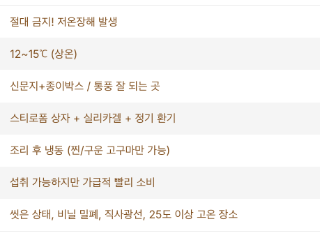| 보관 피해야 할 조건 | 씻은 상태, 비닐 밀폐, 직사광선, 25도 이상 고온 장소 |