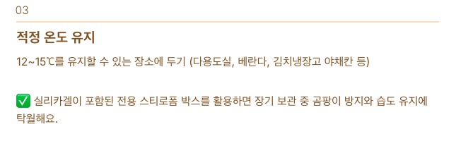 - 12~15℃를 유지할 수 있는 장소에 두기 (다용도실, 베란다, 김치냉장고 야채칸 등)