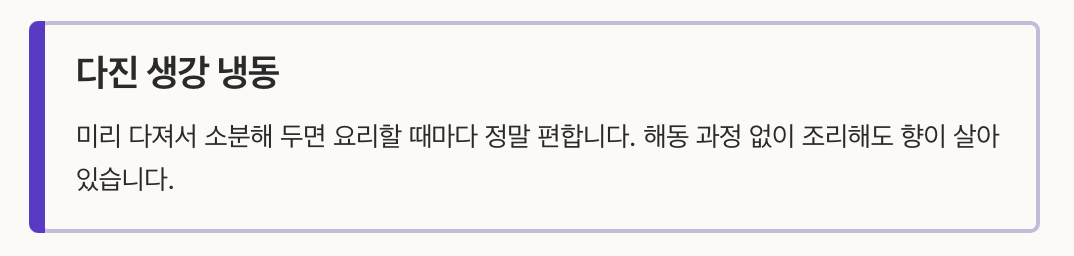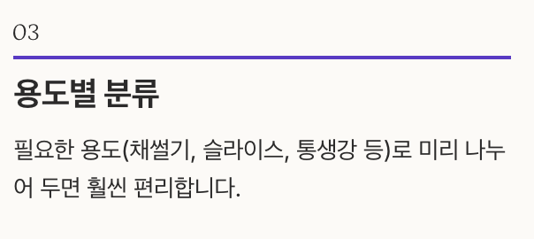 3. 필요한 용도(채썰기, 슬라이스, 통생강 등)로 미리 나누어 두면 훨씬 편리합니다.