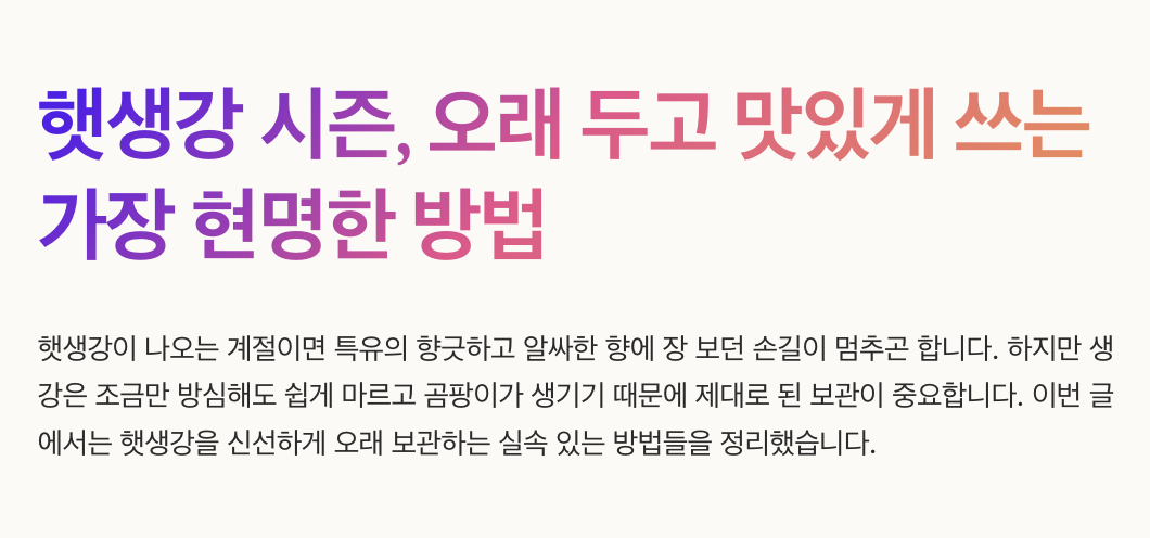 햇생강이 나오는 계절이면 특유의 향긋하고 알싸한 향에 장 보던 손길이 멈추곤 합니다. 하지만 생강은 조금만 방심해도 쉽게 마르고 곰팡이가 생기기 때문에 제대로 된 보관이 중요합니다. 이번 글에서는