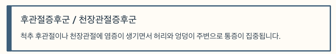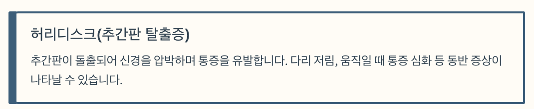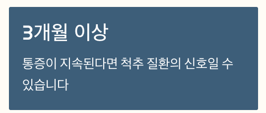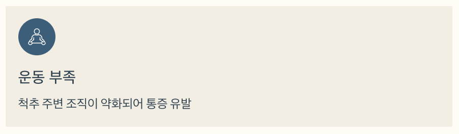 | 운동 부족 | 척추 주변 조직이 약화되어 통증 유발 |