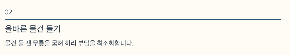 - 물건 들 땐 무릎을 굽혀 허리 부담을 최소화합니다.
