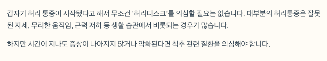 갑자기 허리 통증이 시작됐다고 해서 무조건 '허리디스크'를 의심할 필요는 없습니다. 대부분의 허리통증은 잘못된 자세, 무리한 움직임, 근력 저하 등 생활 습관에서 비롯되는 경우가 많습니다. 하지만 시간이 지나도 증상이 나아지지 않거나 악화된다면 척추 관련 질환을 의심해야 합니다.