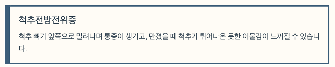 척추 뼈가 앞쪽으로 밀려나며 통증이 생기고, 만졌을 때 척추가 튀어나온 듯한 이물감이 느껴질 수 있습니다. - 후관절증후군 / 천장관절증후군