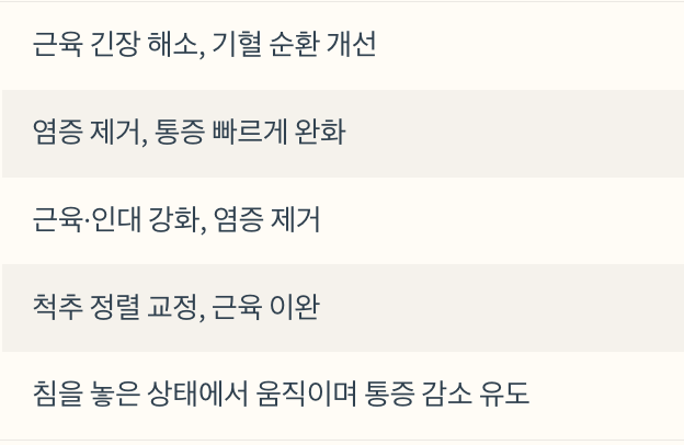 | 침 치료 | 근육 긴장 해소, 기혈 순환 개선 |