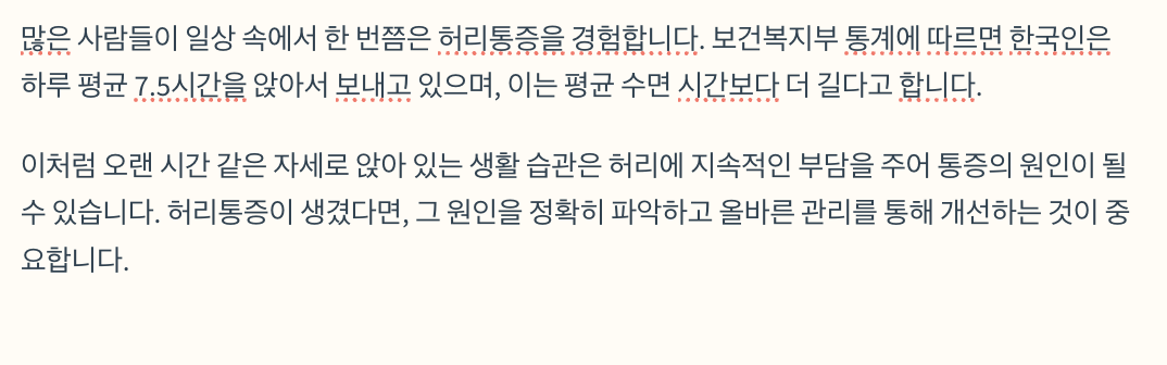 많은 사람들이 일상 속에서 한 번쯤은 허리통증을 경험합니다. 보건복지부 통계에 따르면 한국인은 하루 평균 7.5시간을 앉아서 보내고 있으며, 이는 평균 수면 시간보다 더 길다고 합니다. 이처럼 오랜 시간 같은 자세로 앉아 있는 생활 습관은 허리에 지속적인 부담을 주어 통증의 원인이 될 수 있습니다. 허리통증이 생겼다면, 그 원인을 정확히 파악하고 올바른 관리를 통해 개선하는 것이 중요합니다.