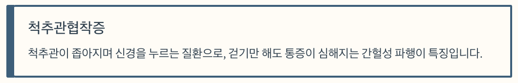 추간판이 돌출되어 신경을 압박하며 통증을 유발합니다. 다리 저림, 움직일 때 통증 심화 등 동반 증상이 나타날 수 있습니다. - 척추관협착증