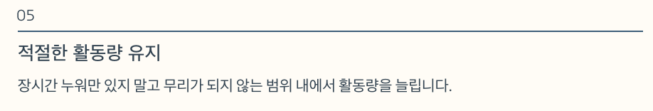 - 장시간 누워만 있지 말고 무리가 되지 않는 범위 내에서 활동량을 늘립니다.