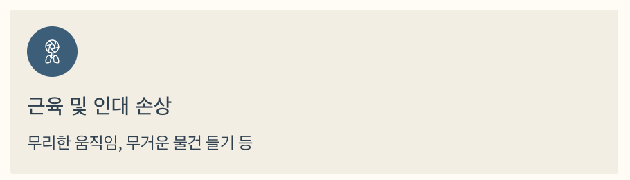 | 근육 및 인대 손상 | 무리한 움직임, 무거운 물건 들기 등 |