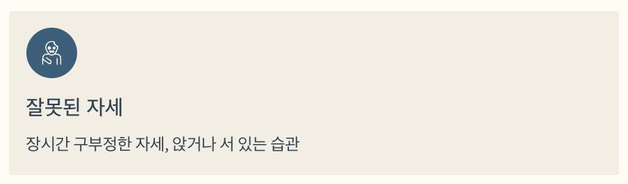 | 잘못된 자세 | 장시간 구부정한 자세, 앉거나 서 있는 습관 |