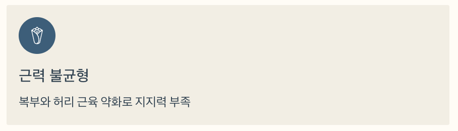 | 근력 불균형 | 복부와 허리 근육 약화로 지지력 부족 |