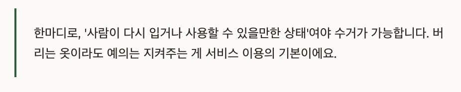 한마디로, ‘사람이 다시 입거나 사용할 수 있을만한 상태’여야 수거가 가능합니다. 버리는 옷이라도 예의는 지켜주는 게 서비스 이용의 기본이에요.