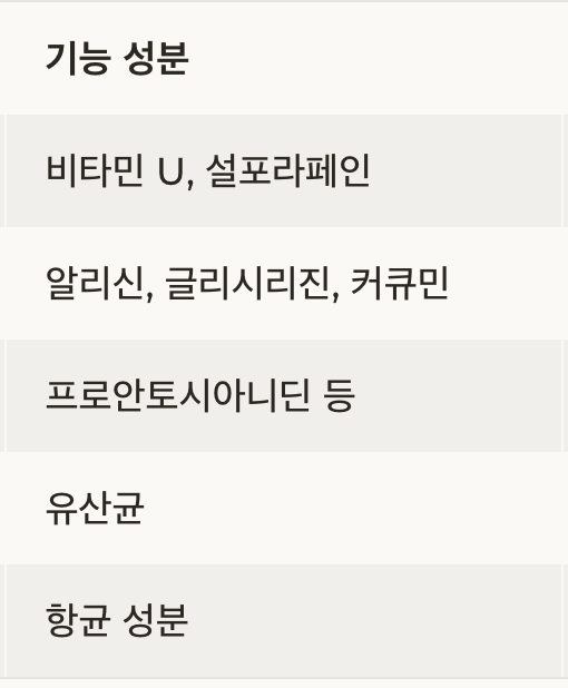 | 향신료 | 마늘, 감초, 강황 | 알리신, 글리시리진, 커큐민 | 항균, 항염, 위산 억제 |