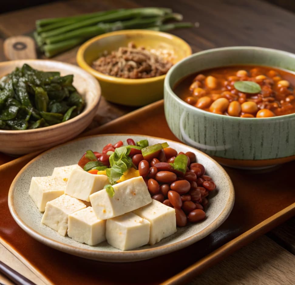 콩조림, 청국장, 낫토, 두부 샐러드, 된장찌개 등으로 구성하면 콩을 일상적으로 즐길 수 있습니다.