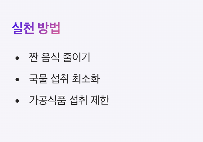 | 식습관 | 저염식, 가공식품 줄이기 | 혈압 직접 감소 |