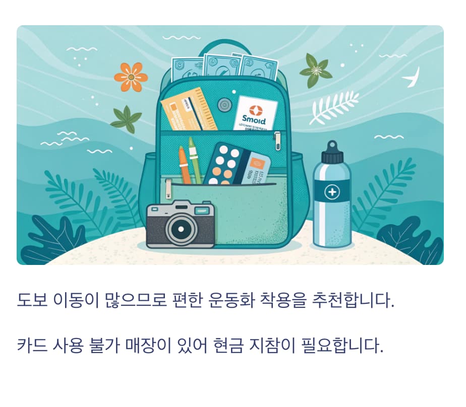 | 멀미약, 신분증, 생수, 선크림 | 카메라, 방수팩, 여벌 옷 |