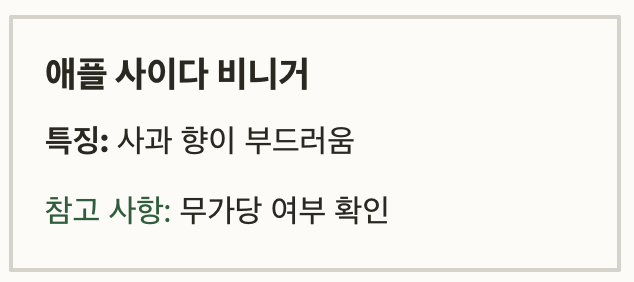 | 애플 사이다 비니거 | 사과 향이 부드러움 | 무가당 여부 확인 |