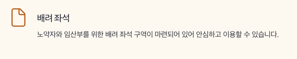 유모차나 웨건은 접어서 모노레일에 실을 수 있으며, 모든 좌석은 입석 형태입니다. 대신 노약자와 임산부는 배려 좌석 구역이 마련되어 있어 안심하고 이용할 수 있습니다.