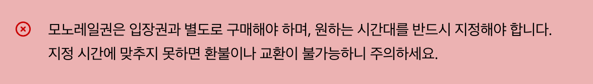 모노레일권은 입장권과 별도로 구매해야 하며, 원하는 시간대를 반드시 지정해야 합니다. 지정 시간에 맞추지 못하면 환불이나 교환이 불가능하니 주의하세요.