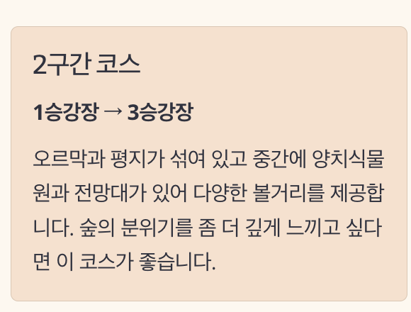 2구간은 1승강장에서 3승강장까지로, 오르막과 평지가 섞여 있고 중간에 양치식물원과 전망대가 있어 다양한 볼거리를 제공합니다. 숲의 분위기를 좀 더 깊게 느끼고 싶다면 이 코스가 좋습니다.