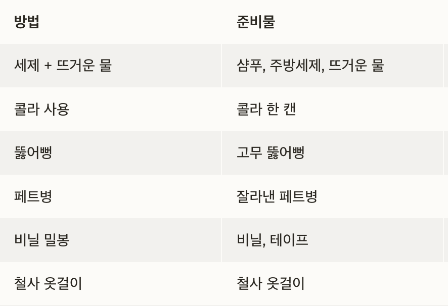 | 세제 + 뜨거운 물 | 샴푸, 주방세제, 뜨거운 물 | 약한 막힘에 효과적 |