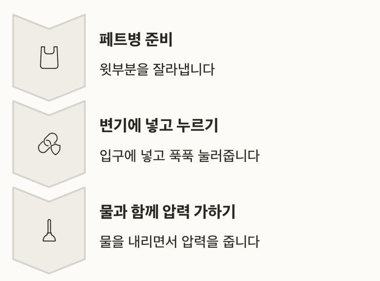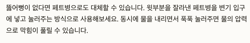 뚫어뻥이 없다면 페트병으로도 대체할 수 있습니다. 윗부분을 잘라낸 페트병을 변기 입구에 넣고 눌러주는 방식으로 사용해보세요. 동시에 물을 내리면서 푹푹 눌러주면 물의 압력으로 막힘이 풀릴 수 있습니다.