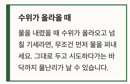물을 내렸을 때 수위가 올라오고 넘칠 기세라면, 무조건 먼저 물을 퍼내세요. 그대로 두고 시도하다가는 바닥까지 물난리가 날 수 있습니다.