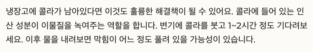 | 콜라 사용 | 콜라 한 캔 | 유기물 막힘에 좋음 |