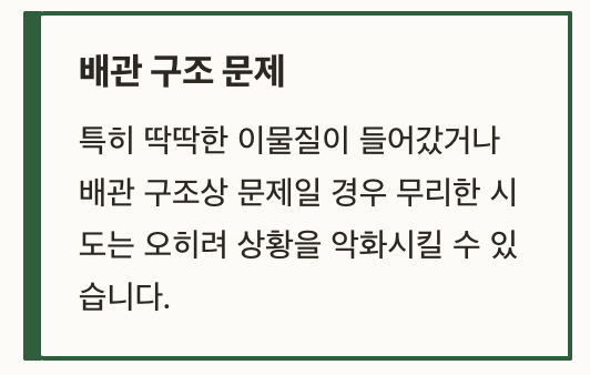 또한, 다양한 시도에도 불구하고 막힘이 전혀 해소되지 않는다면, 무리하지 말고 바로 전문가의 도움을 받는 것이 좋습니다. 특히 딱딱한 이물질이 들어갔거나 배관 구조상 문제일 경우 무리한 시도는 오히려 상황을 악화시킬 수 있습니다.